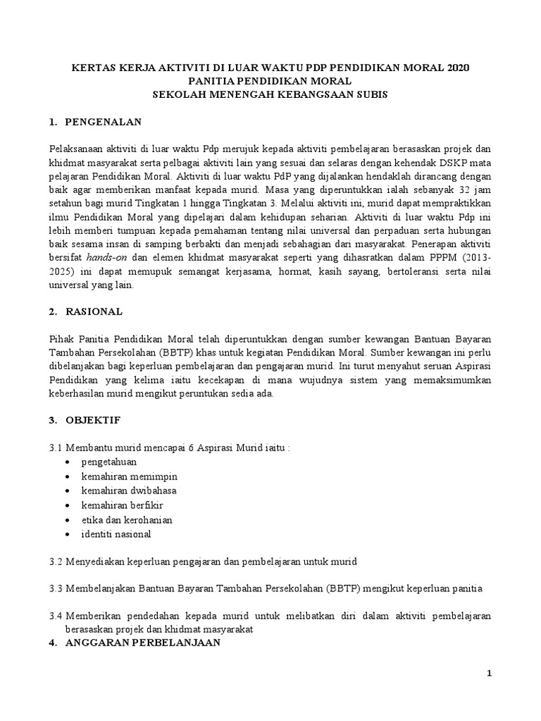 Kertas Kerja Aktiviti Di Luar Pdp P Moral 2020 Pdf